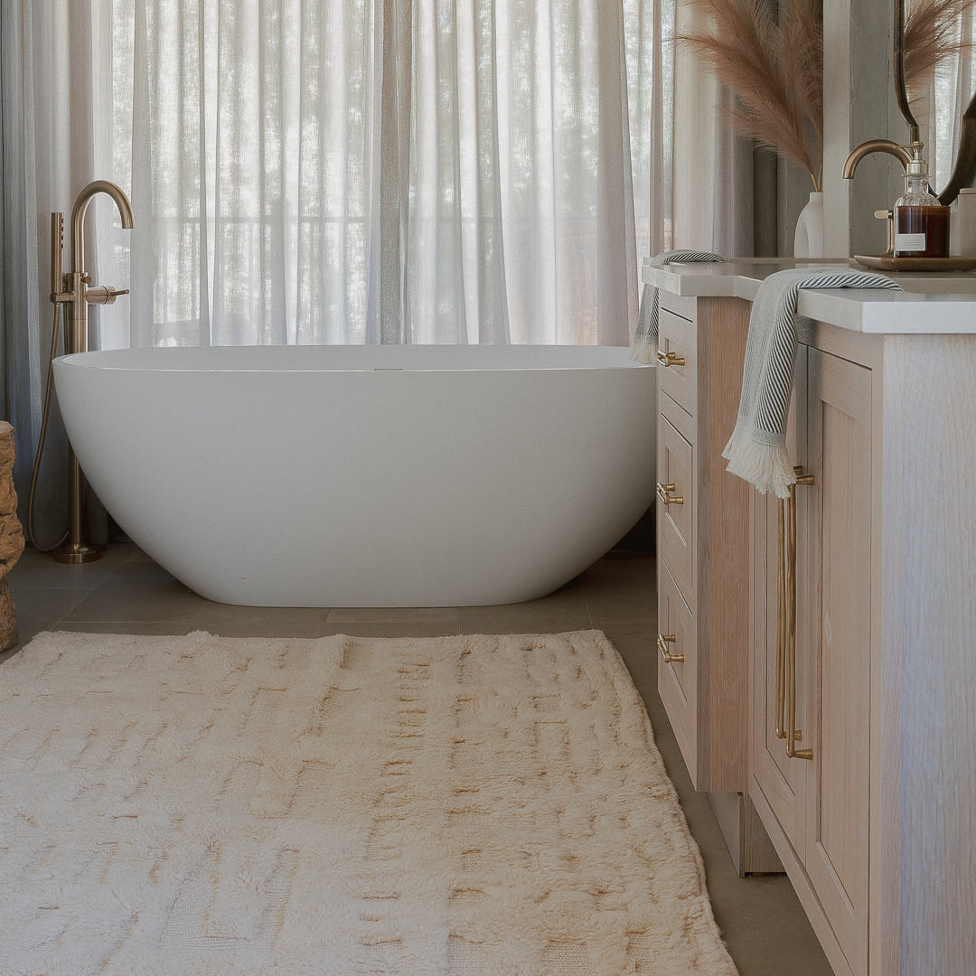 The Cloud Carpet is a luxurious, cream-hued rug that embodies the lightness and softness of a gentle sky. Hand-knotted by skilled women artisans in Morocco, its varying pile heights create an ever-changing texture reminiscent of drifting clouds. Made to order in any size and designed by artist Lauren Fuhr, this piece not only elevates your space with its serene elegance but also reflects our commitment to ethical craftsmanship, livable wages, and empowering work environments.