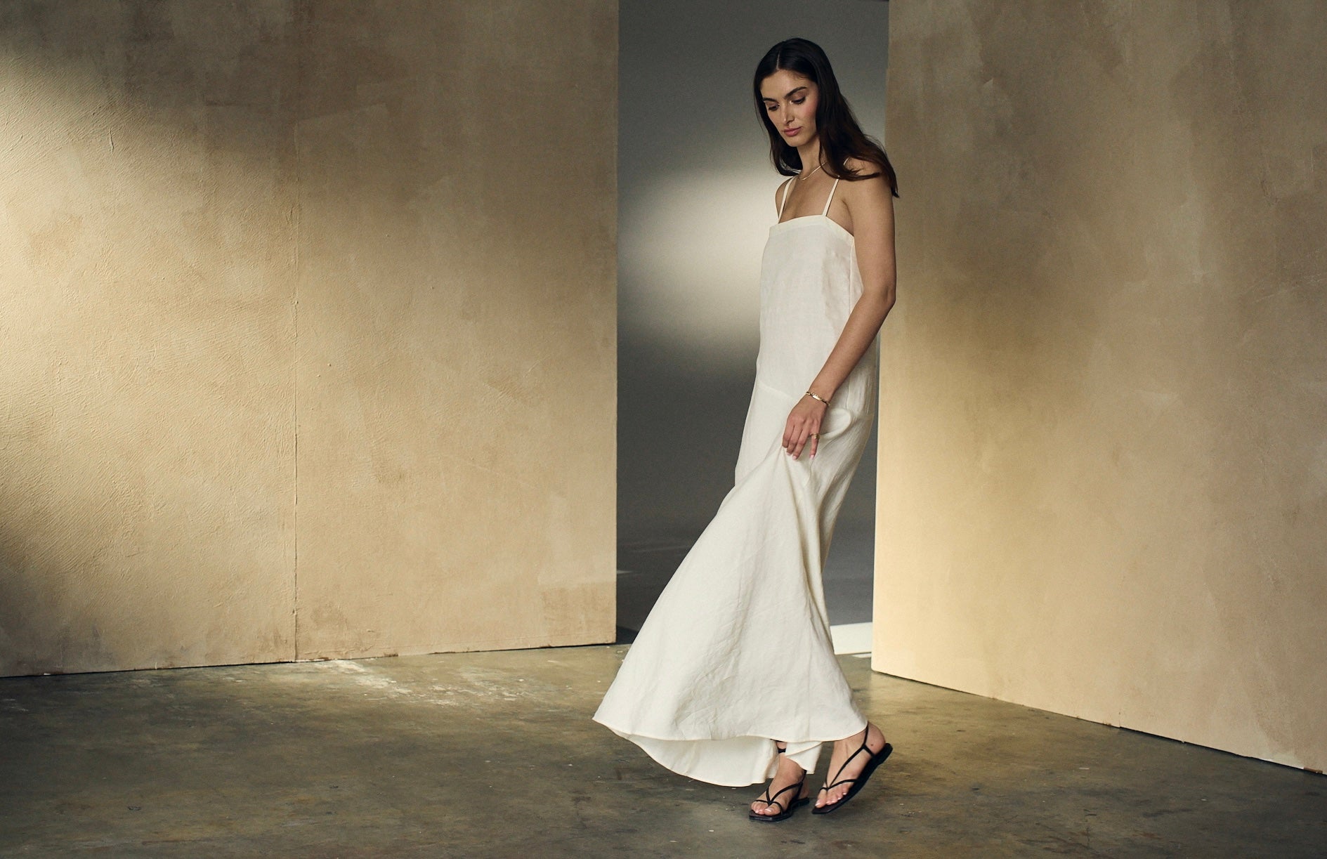 The Edie dress is effortless sophistication in linen with an asymmetrical drop waist, bias cut bottom panel for flowing movement, adjustable straps and tie back to allow for the perfect fit. This dress flows easily from day to elevated nights and layers beautifully.